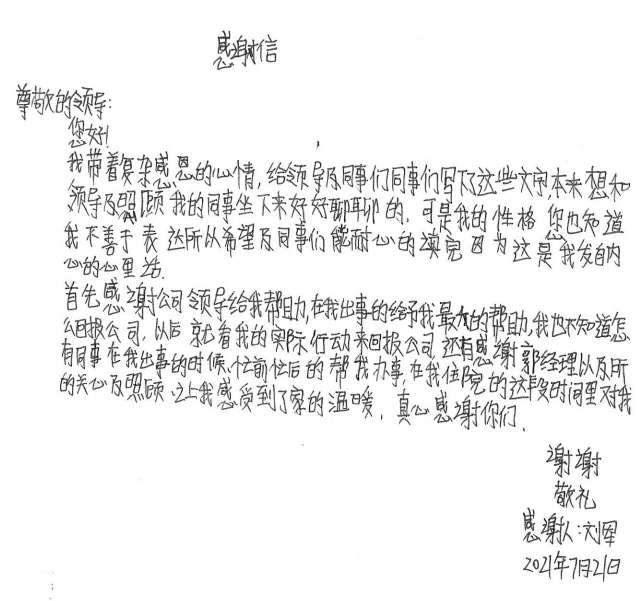 经过半个月治疗休养,刘军手部已无大碍。出院后的他写了一封感谢信并为公司送了一面锦旗,他说道,是米兰·官方端网站-AC Milan(中国)这个大家庭让他感受到了关怀和温暖,他表示要把这种关怀变成工作上的动力,争取早日返回工作岗位,努力工作,回报大家的关心和关爱。